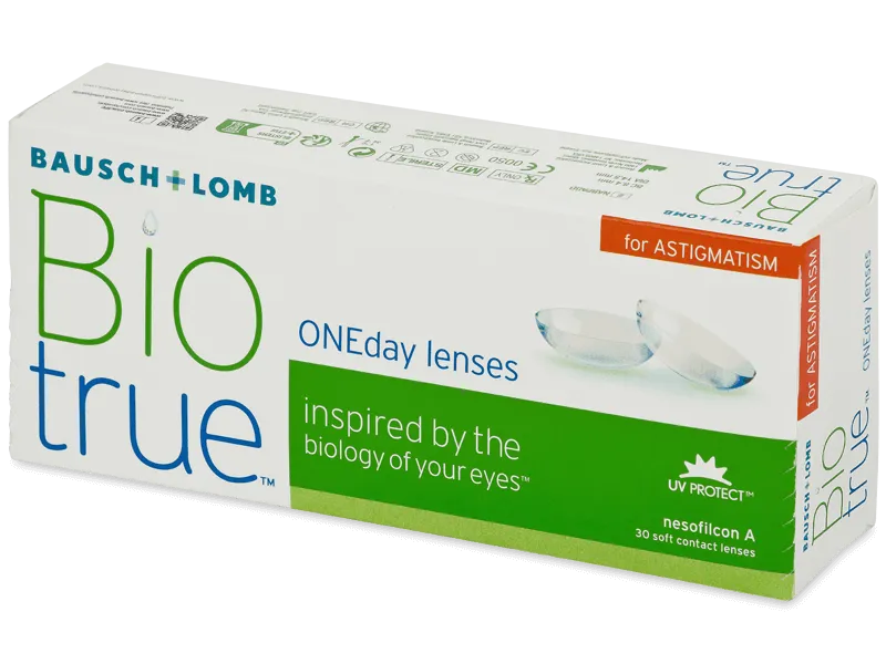 Created using HyperGel material (Nesofilcon A) to ensure high water content and oxygen permeability, these toric lenses from Bausch & Lomb provide exceptional comfort and performance throughout the day. Biotrue ONEday for Astigmatism are available here in a 30 pack. These daily disposable lenses relieve all of the annoyances caused by astigmatism like headaches and blurred vision.Biotrue ONEday for Astigmatism contact lenses are also available in an affordable 90 pack.