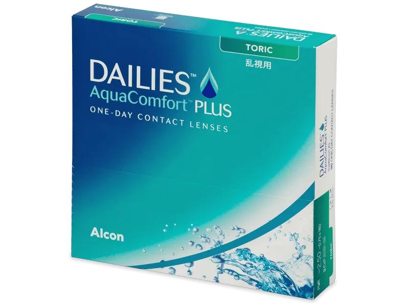 Dailies AquaComfort Plus Toric are daily disposable lenses by Alcon designed to correct astigmatism. They offer triple hydration and refreshing comfort throughout the day and ensure consistent, clear vision in all conditions. This package contains 90 lenses.